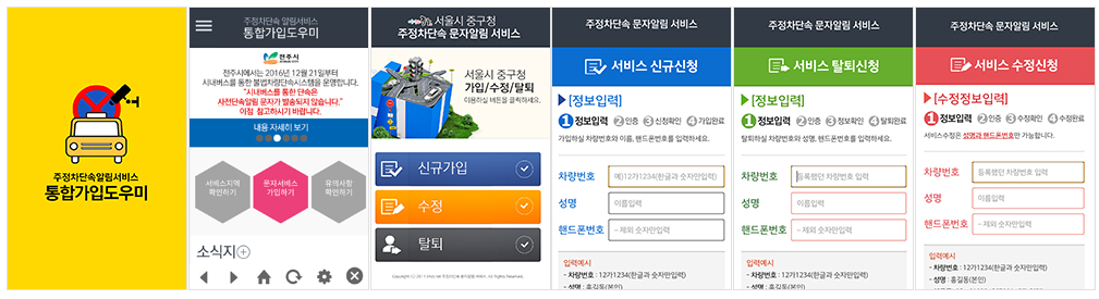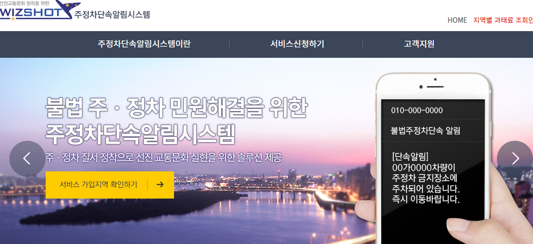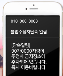 주차단속 알림서비스란 불법 주정차지역의 차량에 대한 CCTV와 이동식 카메라의 단속 내용이 차적조회시스템과 연동하여 자주에게 불법 주정차에 대한 사전경고 안내 메시지를 발송하는 시스템입니다.